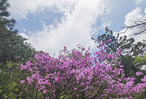 五六月,九華山花台高山杜鵑紛紛盛開,漫山遍野,將最動人的爛漫帶給花台。無論晴天雨天,無論側看仰看,杜鵑皆妖嬈嫵媚且豔麗。在這鮮花爛漫的日子裡,遊客總是忍不住想要和美麗的鮮花合影,花和人的組合,更是藍天白雲之下的微信朋友圈視覺盛宴。我們沿著高山遊覽步道,觀看花台的自然風光。這裡還有奇特的地質地貌,構成九華山最著名的「天然睡佛」奇觀。