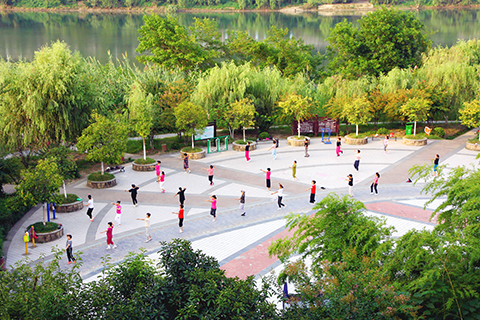 每年夏秋之際,城南河堤和漢江之間的空白地帶常常成為洪水淹沒區。洪水退去後,泥沙裸露,雜物遍地,滿目蕭然。2007年,為了改善人居環境,縣裡開始在這片荒灘上做起了文章。經過幾年的努力,沿江的荒灘華麗變身,成了人們休閒健身的濱江公園。斗折蛇行的步道,碧草如茵的綠地,生機盎然的白楊,造型新穎的廣場,吸引著市民們紛至遝來,自由自在地享受著這裡的一切。人們或聊天,或寫生,或刷屏,或看書,悠然自得。這裡也自然成了我的「打卡地」,我常常來這裡散步,健身,拍照,聽音樂。漫步在江邊,清風拂面,柳絲牽衣,此刻,我已與漢江融為了一體,與小城融為了一體。