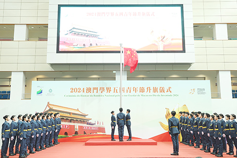 「澳門學界五四青年節升旗儀式」於二0二四年五月四日早上在澳門理工大學體育館舉行。儀式進行前,現場播放了五十九個校部以壁報、書法及繪畫作品,表達傳承五四精神、齊賀雙慶的喜悅。接著,澳門青年管樂團演奏國歌,五星紅旗在澳門學界升旗隊旗手的拉動下冉冉升起。在鏡平中學、教業中學、聖公會(澳門)蔡高中學、中葡職業技術學校及鮑思高粵華小學五所學校合唱團的帶領下,全體人員高唱國歌,場內響徹宏亮的歌聲,洋溢高漲的愛國之情。司儀介紹了五四運動的由來後,分別由澳門演藝學院學生呈獻結合舞蹈、音樂和朗誦的《五四,我們的節日》表演,勞校中學獻上武術表演《龍騰虎躍武動少年》及澳門坊眾學校獻上舞蹈表演《我們看見了鴻雁》。另外,現場亦播放澳門學界升旗隊成立五周年短片,記錄了隊員在中國人民解放軍駐澳門部隊軍官的指導下,五年以來的進步與成長,成為可獨當一面執行任務的升旗隊員。最後,澳門學界升旗隊及學校合唱團合唱《七子之歌》,以洪亮的歌聲莊嚴地表達愛國之情。