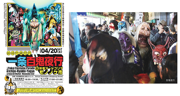 甚麼是「百鬼夜行」?主要指很多妖怪在暗夜裡橫行的盛況。有人認為妖怪是由人創造出來,因為與黑暗為鄰,人們會感到似乎有甚麼東西潛伏在黑暗裡,所以日本民間流傳每當夜幕降臨,各式各樣的妖怪便會出現。在平安時代,傳說有人在京都城內曾遇見了百鬼夜行,在特定的日子和時間會出現一條百鬼夜行的街道,彼世與現世的邊界十分接近,親眼見到的人可能會遭到詛咒而莫明喪命。大家需要留意,日本鬼的概念與中國不同,日文漢字的「鬼」指的是精靈與妖怪。在日本京都一条通的大將軍八神社除了每年十月第三個星期六舉辦例大祭外,那裡的大將軍商店街每年於這個時間晚上也會舉行「百鬼夜行」活動「妖怪ストリート」,有妖怪遊行活動外,還有販賣著各式妖怪主題可愛小物的妖怪市集「モノノケ市」,現場十分熱鬧。可是,去年11月時主辦方﹝註﹞卻在11月宣布百鬼夜行活動在今年改為四月,也不知道明年的活動時間將安排在那個時候,所以大家若有興趣此活動,還是需要自行留意了。◇