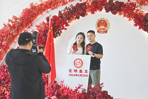 甘肅東鄉:丹霞好似羊肉卷 天津第四屆五大道海棠花節 廣州圖片展紀念辛亥革命 北方花粉過敏高發區發預報 清明:「風清景明處 追思伴春生」 開江魚經濟帶動消費 雲南昆明首個公園式婚姻登記點啟用 2024-05-21 03:30:00 ◎ 五月二十日,一對新人領取結婚證後拍照留念。當日,雲南昆明首個公園式婚姻登記點在盤龍區茨壩街道八七一東區正式啟用。茨壩街道按照婚姻登記機關標准進行規劃佈局,將公園景觀與幸福美好的婚姻登記完美融合,把八七一東東區婚姻登記處打造為公園式婚姻登記處,讓「一紙婚約」融入昆明的城市文化。(中新社記者 李嘉嫻 攝)