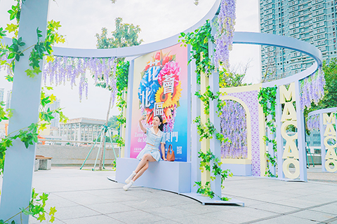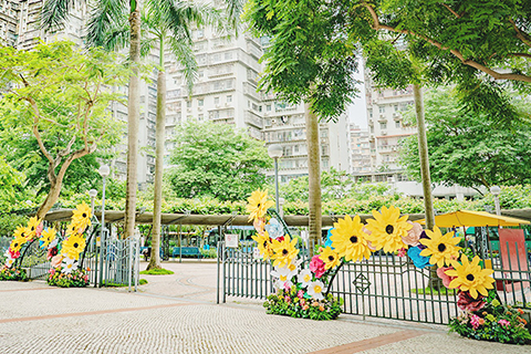 繼四月底推出「綠野迷蹤」及「願望花廊」兩組大型打卡裝置後,昨(二十二)日再推出兩組新裝置,分別是設於黑沙環公園圓形地的「奇夢拱築」裝置,以太陽花為主題打造出充滿活力的巨型花拱門;以及設於筷子基北灣休憩區的「細說花語」裝置,以紗簾般垂下的紫藤花打造成區內休憩和打卡好去處,讓市民和旅客從生活中放慢腳步,感受悠然愜意的一刻。