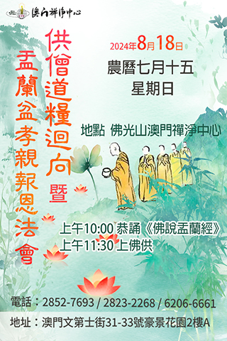 佛光山澳門禪淨中心特於2024年8月18日(農曆七月十五日)舉行供僧道糧迴向暨盂蘭盆孝親報恩法會,諷誦《佛說盂蘭盆經》,讓廣大信眾透過經文提起孝思,功德回向七世父母;常住更藉此一年一度的盛會,把供僧道糧功德回向,仗此殊勝善力,上報四重恩、下濟三塗苦。