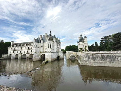 隔天我們開始了盧瓦爾河谷城堡(Châteaux de la Loire)的遊覽。首先遊覽舍農索水上城堡(Château de Chenonceau),這是世界唯一一座建在橋上的城堡,混合了哥特式建築與早期文藝復興建築的風格。城堡的前身在1411年被時被皇家軍隊所放火燒毀,是為了懲罰當時的城主讓·馬奎斯(Jean Marquis)的叛亂活動,後來他在1430年將城堡重建,而且也建立了一座水力磨粉機。