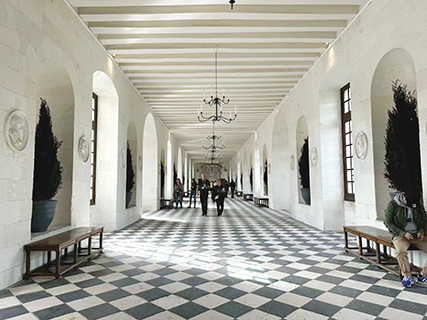 當我走進城堡,印入眼簾的就是哥特式的居所——貴族衛士廳。在城堡的頂端,是米尼木塔樓。騎士坡道,那時的人能聰明想到用這種螺旋形坡道讓馬拉著套車從城堡下一直到城堡頂的平台,類似於今天的旋轉地庫一樣。城堡中一幅畫描繪的是達芬奇死前的狀態,旁邊是弗朗索瓦一世。但是這幅畫並不真實,達芬奇不是在這座城堡內去世的,他去世前弗朗索瓦一世也不在他身邊。這幅畫只是代表了達芬奇在弗朗索瓦一世心中的地位。這裡可以俯瞰盧瓦河,風景獨好。◇