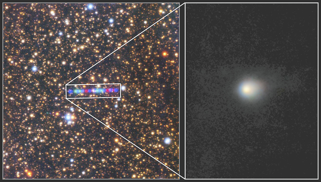 在這些由位於夏威夷基亞山的北雙子望遠鏡所拍攝的影像裡,亦名為C/2025 N1的3I/ATLAS,明顯擁有氣體及塵埃組成的瀰漫彗髮,因此,顯然是一顆彗星。左側圖板的紅、綠、藍波段影像數據,呈現了這顆彗星在背景恆星之間移動的軌跡。右側圖板則是將這些數據對齊疊加後,組合出的清晰彗星影像。從它的運動軌跡得以確認,彗星3I/ATLAS具有高離心率的雙曲線軌跡,因此,它不會繞太陽轉圈,而是會回到星際空間。這顆來自太陽系外的闖入者,已來到木星的軌道之內,在最靠近太陽時,預期會行進到火星的軌道內,但並不會對地球造成威脅。