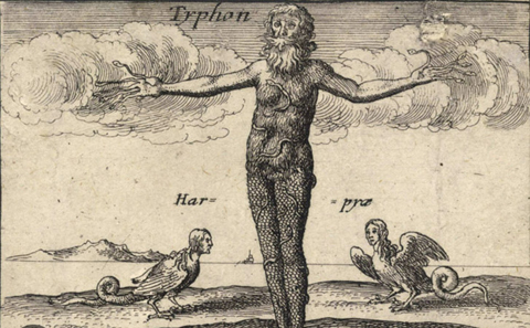 關於颱風的其他神話還有:希臘神話裡的泰風(有的稱為「颱風」,Typhon),下半身是蛇,有鳥的翅膀,也有不同動心動物的象徵,是大地之母蓋亞的兒子,與宙斯是同父異母的兄弟,同時晬一名身材高大和很強狀的巨人。某天,宙斯這好色之徒又在做壞事,泰風見機不可失,把其閃電偷走藏起,同時直奔奧林帕斯山破壞宙斯的城堡,到宙斯發現時,由於沒閃電,及後也發現原來閃電在泰風那裡,結果宙斯打輸了。宙斯不忿,也運用計謀將一名部下變成牧童,前往泰風的宮殿,運用笛聲誘騙泰風交出閃電作加持笛子之用,結果成功了,宙斯取回閃電後,右手用冰霜之刃把泰風的隻手斬下來,並將其封印在水山裡,後來,泰風只要抓到機會,便會衝出封印用暴風肆虐人間。