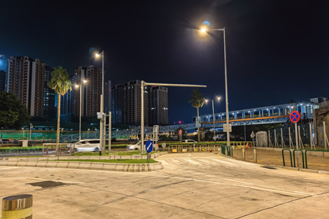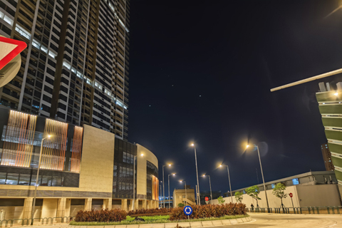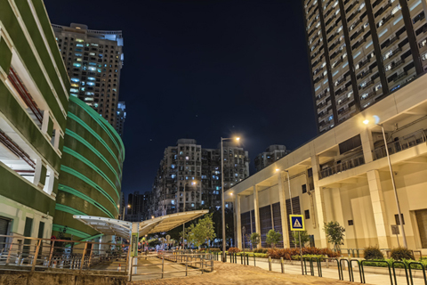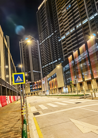 某晚我前往松柏街逛一逛。在東北大馬路轉入的街口行入去,奇怪的是,見不到路牌,可能中間隔離帶被水馬攔住,路牌藏在當中?但一直走到街尾,都不見路牌;在右邊見到樂居巴士總站的出口(憑門前豎了兩個不准進入的交通標誌而猜度,見附圖,具體如何,待巴士站啟用後才知曉);續前行,途經污水處理廠停車場側,來到樂居大樓的最後一座,對面是豪宅明珠都匯。