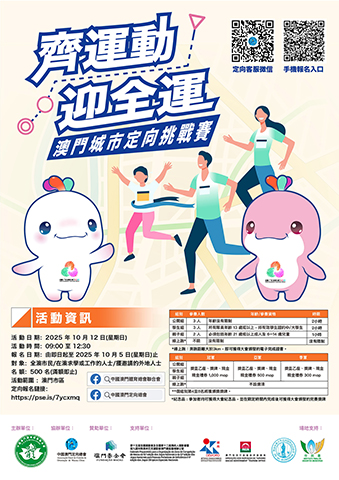 【特訊】由中國澳門體育總會聯合會主辦,澳門基金會贊助,中國澳門定向總會協辦,第十五屆全國運動會及全國第十二屆殘疾人運動會暨第九屆特殊奧林匹克運動會澳門賽區籌備辦公室、澳門特別行政區政府體育局、澳門特別行政區政府旅遊局、珠海青少年定向運動協會支持,市政署提供場地支持的「齊運動、迎全運」澳門城市定向挑戰賽現正接受報名將於2025年10月12日(周日)舉行。活動旨在慶祝粵港澳合辦中華人民共和國第十五屆運動會,盼透過城市定向活動,讓市民及旅客一齊歡慶此次全運會,融入本次的體育盛事;用定向比賽帶領市民及旅客一齊探索澳門這個中西文化交織的城市,是一次讓所有人融入在澳門的全新體驗,使參加者們真正認識澳門、感受澳門;同時,透過定向運動宣揚「和諧共融•樂居澳門」理念及宣傳「齊運動,健體魄」的大眾體育理念。