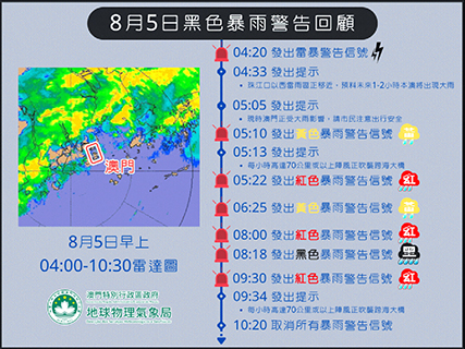 氣象局表示,昨日凌晨,大雨開始持續影響珠江口附近地區。約凌晨4時許,本澳以西地區出現新一波強雨區。第一波暴雨集中於5時至6時30分,氣象局先後發出黃色及紅色暴雨警告。該時段暴雨較集中影響澳門半島,其中澳門北區雨勢最為明顯,錄得最大一小時滾動累積雨量達61.8毫米。