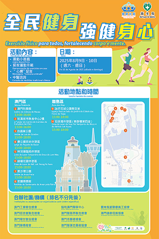 為積極落實「健康社區」計劃推動居民進行規律運動,響應國家八月八日「全民健身日」,以及今年澳門承辦第十五屆全國運動會部份競賽項目,衛生局聯同本澳十個社團機構於本周六、日(八月九日至十日)下午在本澳各區設置十個以「全民健身.強健身心」為主題社區諮詢站,深入社區向居民推廣運動的重要性,營造全民運動和隨時隨地做運動的良好氛圍,促進居民身心健康。活動內容包括:運動小遊戲、居家運動示範、中醫諮詢,以及向居民宣傳防範基孔肯雅熱及登革熱、心理健康等。同時,教育及青年發展局積極響應「全運社區行」活動,將組織志願者走進上述社區諮詢站部份站點,向公眾宣傳「十五運會及殘特奧會」資訊。
