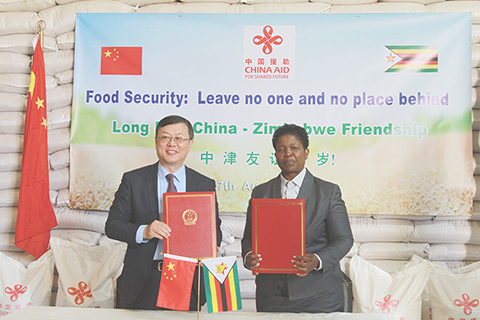 ◎ 中國向津巴布韋提供新一批近三千噸糧食援助交接儀式八月七日在津首都哈拉雷舉行。圖為當日,在津巴布韋首都哈拉雷舉行的中國向津巴布韋提供糧食援助交接儀式上,中國駐津巴布韋大使周鼎(左)與津巴布韋公共服務、勞工與社會福利部副部長默西.迪納合影。(新華社發 塔法拉 攝)