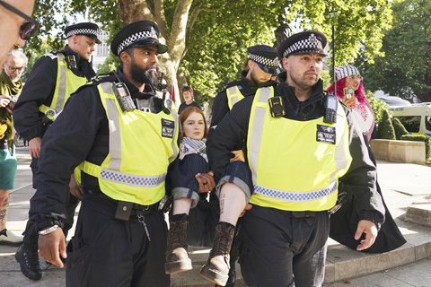 倫敦警方表示,警方逮捕示威民眾的理由是他們「支持遭禁組織」。