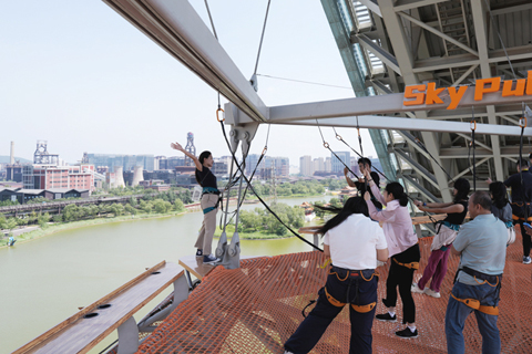 ◎ 八月十一日,市民在北京首鋼滑雪大跳台「心跳咖啡」平台遊覽。在二0二五年服貿會期間,公眾可參與體驗首鋼滑雪大跳台「頑酷心跳塔」項目,該項目利用大跳台本體空間資源,營造出繩降、「心跳咖啡」等七個極限探險類小項。據悉,二0二五年中國國際服務貿易交易會將從過去的國家會議中心和首鋼園區「兩址舉辦」調整為首鋼園「一址舉辦」,目前,首鋼園區正完善功能需求和優化配套設施,做好一個月後二0二五年服貿會的服務保障工作。(中新社記者張祥毅 攝)