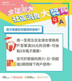 活動期間每逢周六、日,消費者透過承辦單位電子錢包在全澳可核銷電子優惠的商戶單筆實付50元,可自動參加每周抽獎,每周將抽出三位幸運兒各得8,000澳門元現金獎。