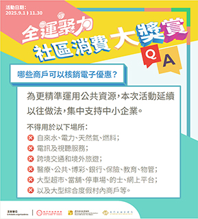 是次活動消費優惠的適用範圍,除抽取優惠的交易場景限制,亦不包括跨境交通服務、境外旅遊服務、醫療服務、博彩活動場所、銀行及保險公司及其他金融機構、當押店、大型連鎖超市、物業管理公司、教育機構、停車場、的士、咪錶、自助售賣機以及大型綜合旅遊休閒企業設施內的商戶,以精準扶持民生區,引流市民到社區消費。