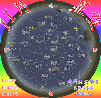 水星留時間為11月10日7點。木星留時間為11月12日3點。火星在11月13日2點合水星,北1.31°。水星在11月20日17點內合。天王星衝時間為11月21日20點,亮度5.6等,視直徑3.8"。水星合金星時間為11月25日12點。(北1.05°)土星環次小傾角時間為11月25日。(南0.4°)土星留時間為11月29日8點。水星留時間為11月29日23點。◇(建燁)