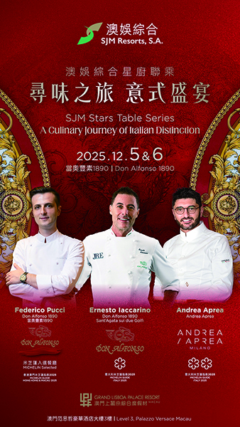 Andrea Aprea曾在眾多米芝蓮餐廳任職,憑藉紮實廚藝功底與創新烹飪理念,其在米蘭創立的同名餐廳後迅速斬獲米芝蓮二星殊榮,成為國際餐飲界關注的焦點;Ernesto Iaccarino出身於意大利著名餐飲世家,其家族經營的「當奧豐素1890」餐廳不僅榮獲米芝蓮一星,更秉持「農場到餐桌」的烹飪哲學,所有食材均精選自家族有機農場Le Peracciole,以新鮮本味演繹意式經典;坐鎮上葡京「當奧豐素1890」的總廚Federico Pucci精通意大利各地風味,擅長在傳承中注入巧思。是次三位名廚強強聯手,將各自專長與獨特理念融為一體,採用以可持續方式採購的食材,將意大利美食文化精髓帶到澳門。
