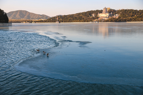 ◎ 十二月八日,北京頤和園昆明湖大面積結冰,冰封的湖面與山巒、古建相互映襯。(中新社記者 易海菲 攝)