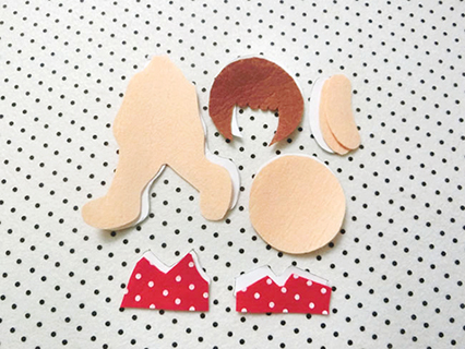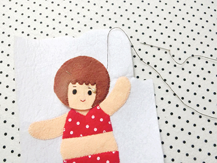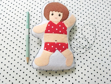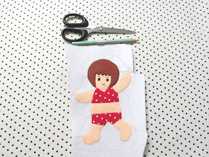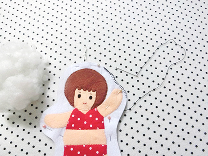 (八)將裁剪好的娃娃,用珠針固定在一塊絨布的布面上,再沿圖案形狀裁剪好;接著在適合位置套入對摺了的棉繩,再以鎖針的方法縫製及塞滿棉花。