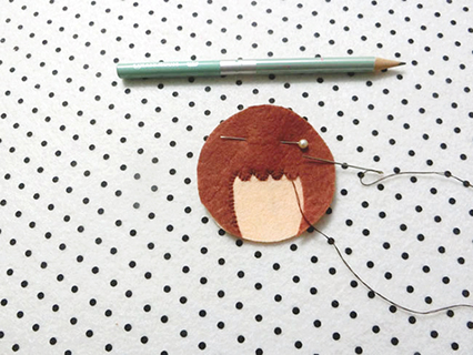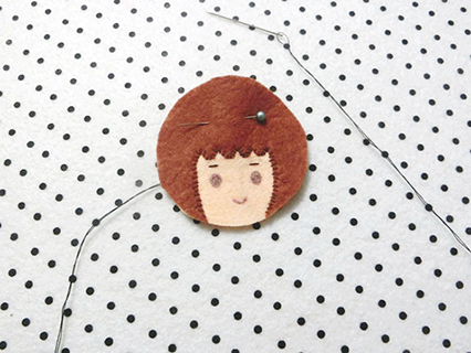 (六)用珠針將頭部布固定在身體頸部的適合位置上,再以斜針的方法縫製。