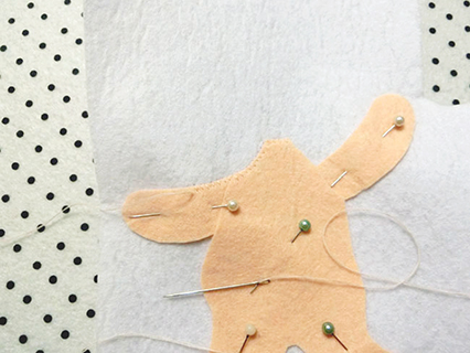 (四)用珠針將身體布及手部布固定在白色絨布的布面上,再以斜針的方法縫製。