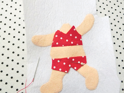 (五)用珠針將上衣服布及短褲布固定在身體布的布面適合位置上,再以斜針的方法縫製。