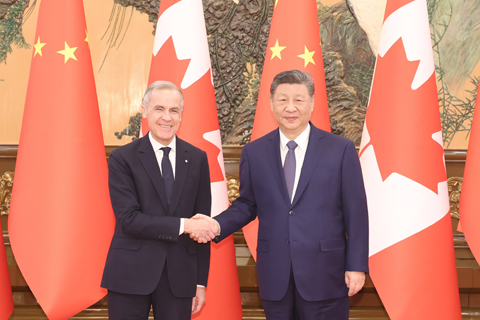 【中新社北京一月十六日電】一月十六日上午,中國國家主席習近平在北京人民大會堂會見來華進行正式訪問的加拿大總理卡尼。