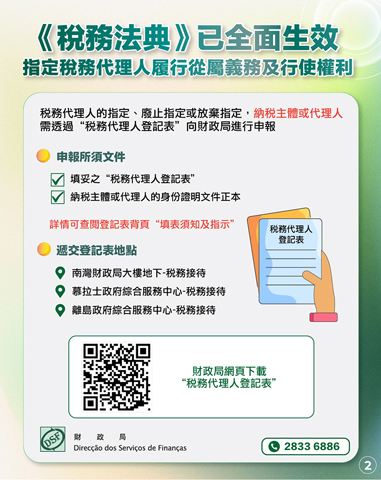 倘公眾對《稅務法典》有任何疑問,歡迎瀏覽專題網站https://cf.dsf.gov.mo或致電稅務查詢熱線二八三三六八八六。財政局並呼籲公眾,協助提醒親友留意《稅務法典》的相關重點資訊。◇