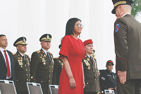 ◎ 委內瑞拉軍方一月二十八日承認代總統德爾西.占士洛迪古斯為最高統帥。圖為當日,委內瑞拉代總統德爾西·占士洛迪古斯(前左)在加拉加斯出席軍方活動。(新華社發 委內瑞拉總統府供圖)