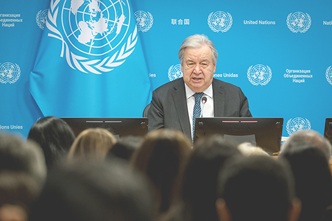 ◎ 聯合國秘書長古特雷斯一月二十九日在年初記者會上強調多邊機構的重要性,呼籲通過強化多邊機構應對全球挑戰。圖為當日,聯合國秘書長古特雷斯舉行年初記者招待會。(新華社發 聯合國供圖/馬克.加滕 攝)