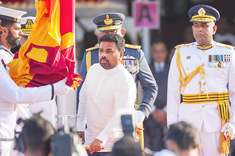 ◎ 二月四日是斯里蘭卡的獨立日。圖為當日,在斯里蘭卡首都科倫坡,斯里蘭卡總統迪薩納亞克(中)出席獨立日慶祝活動。(新華社發 蒂拉納.卡盧托塔格 攝)