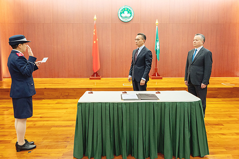 【特訊】昨(五)日上午在保安司司長辦公室舉行澳門海關助理關長就職儀式,儀式由保安司司長陳子勁主持,並在海關領導及一眾官員的見證下,吳嘉慧關務總長進行宣誓及簽署就職狀,就任為海關助理關長。