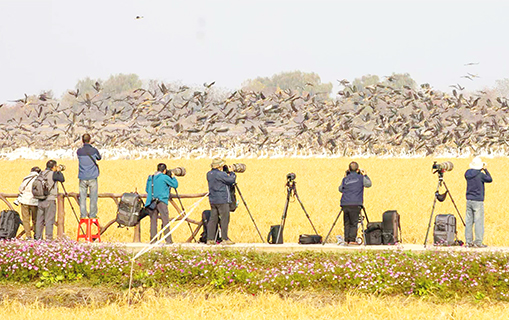 2020年,一場寒露風吹倒插旗分場大片水稻,成群候鳥飛來覓食。從那年起,江西余干對插旗分場千畝水稻祗種不收,按每畝1300元人民幣補償農戶,打造「候鳥家園」。
