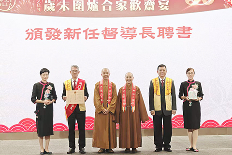 在一眾貴賓見證之下,澳門佛光協會新一任督導長,以及協會轄下六個分會完成了交接儀式,並接受聘書,承擔起「自我提升,服務社會」的使命。法師帶領理監事成員為澳門社會祈福,祈願佛光普照,社會祥和繁榮。
