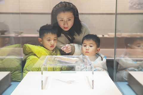 ◎ 二月七日,家長和小朋友在「江海起源 文明之光——青墩遺址出土文物『回鄉』展」欣賞展品。當日,「江海起源 文明之光——青墩遺址出土文物『回鄉』展」在江蘇省海安市博物館啟幕。本次展覽匯集了包括國家一級文物有柄穿孔紅陶斧在內的一百卅八件珍貴文物,其中一百廿七件來自南京博物院與南通博物苑。展覽為期三個月。(新華社發 顧彬斌 攝)