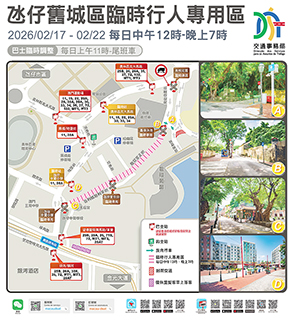 【特訊】新春期間,氹仔舊城區、關前後街一帶於2月17日至22日,每日中午12時至晚上7時實施臨時行人專用區。經跨部門統籌協調、收集及平衡社區相關持份者意見,並參考過往實施相關工作的實際情況,活動周邊區域將實施交通管制及公交分流措施,敬請公眾留意有關資訊。