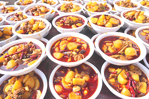 ◎ 二月十一日,「年味火石岩團圓千家宴」活動在四川天府新區正興街道火石岩村舉行,二千八百餘位村民歡聚一堂,喜迎新春。該千人團圓宴以散養黑豬、有機蔬菜等生態食材進行烹制,還原地道鄉村年味。圖為千家宴上的菜肴。(中新社記者 安源 攝)