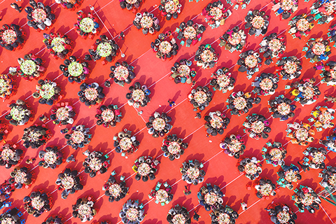 ◎ 二月十一日,重慶市南岸區南坪街道舉行第十二屆「千人同慶百家宴」活動。活動邀請環衛工人、外賣小哥等基層勞動者代表與轄區居民共二千六百人歡聚一堂,共叙鄰里情,喜迎新春佳節。(中新社記者 何蓬磊 攝)