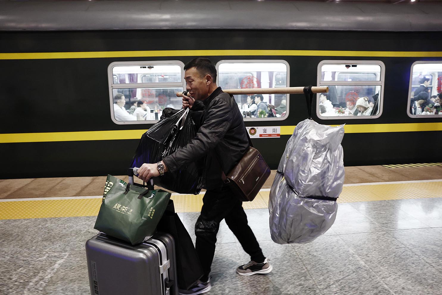 ◎ 二月十一日十七時廿六分,K1127/6次旅客列車從鐵路上海站駛出,前往襄陽站。近二十小時的歸家旅途中,二百三十六名長三角地區務工的湖北籍旅客,在車廂內上演了自編自導的「列車春晚」。圖為二月十一日晚,旅客帶著行李在杭州南站準備上車。(中新社記者 殷立勤 攝)