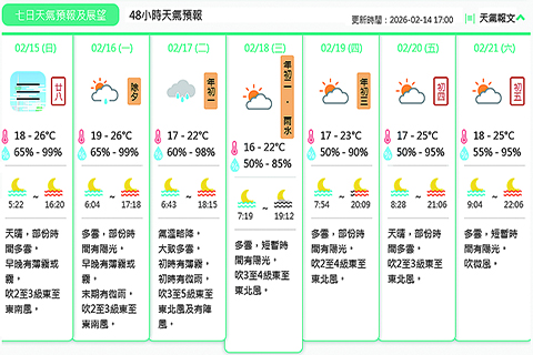 【特訊】地球物理氣象局消息:受偏東氣流影響,預料未來數日早晚天氣潮濕,有薄霧或霧,日間溫暖。展望一股東北季風將於年初一抵達華南沿岸,屆時氣溫略降及雲量增多;隨後春節假期早晚天氣清涼,天色逐漸好轉。