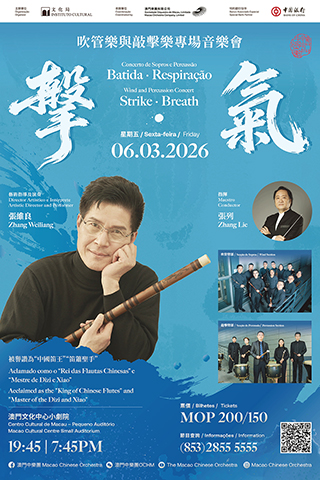 澳門中樂團吹管樂與敲擊樂專場音樂會《擊‧氣》,將於3月6日(周五)晚上7時45分在澳門文化中心小劇院上演。音樂會由澳門中樂團音樂總監兼首席指揮張列執棒,著名笛子演奏家張維良擔任藝術指導,通過澳門中樂團吹管樂與敲擊樂聲部的巧妙對話,為樂迷帶來融和擊樂鏗鏘與吹管氣韻的音樂會,綻放中樂魅力。