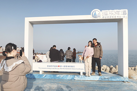 ◎ 二月二十日,遊人在孤東海堤合影留念。當日是中國農曆正月初四,位於山東東營的孤東海堤上人頭攢動,熱鬧非凡。孤東海堤始建於1986年,是勝利油田為保障孤東採油廠沿海石油生產而修建的人工防潮堤,被譽為「海上長城」。(中新社發 孫琳茹 攝)