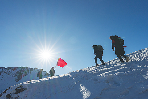 冬日時節,西藏山南市隆子縣玉麥鄉的群山覆蓋著積雪。四名護邊員晨光中行進在雪山間,五十歲的普布羅布肩扛國旗,走在隊伍最前面,索朗多吉、拉巴次仁、洛桑羅布緊跟其後。