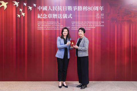 【特訊】為弘揚偉大抗戰精神,深化愛國主義教育,中央人民政府向澳門特別行政區政府贈送「中國人民抗日戰爭勝利八十周年紀念章」,贈送儀式昨日(二月二十七日)於澳門博物館舉行,紀念章隨即在澳門博物館一樓大堂展出。
