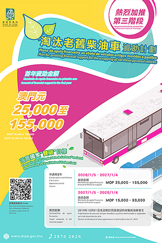 第三階段《淘汰老舊柴油車資助計劃》的資助對象為2019年12月31日或之前註冊及登記的老舊柴油車車主,但不包括在2025年12月15日或之後已被取銷註冊且其後重新註冊的老舊柴油車車主,以及結欠澳門特別行政區債務的柴油車車主。首年的申請期由2026年1月5日至2027年1月4日,資助金額由25,000澳門元至155,000澳門元不等。第二年的申請期由2027年1月5日至2028年1月4日,資助金額由15,000澳門元至93,000澳門元不等。