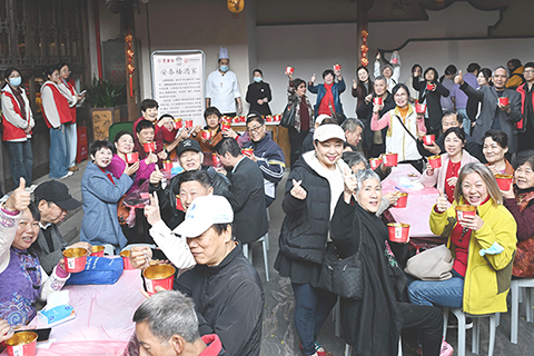 活動現場,香氣撲鼻的拗九粥免費供應,台胞一同品嚐這份傳統美食,感受節日氛圍。