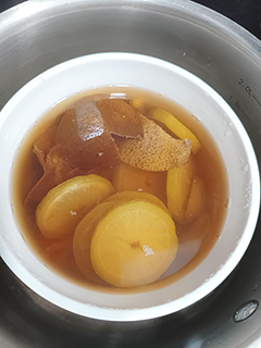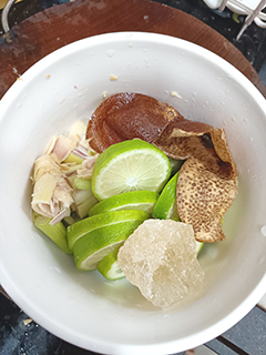 香茅檸檬陳皮燉冰糖:香茅兩三支取莖部剁碎,檸檬一個切片,陳皮一個,用燉盅加水後燉半小時左右,再加冰糖,溶後便可,分兩三次飲用。