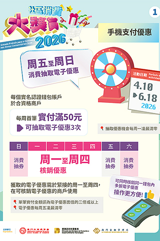 活動將於4月10日正式啟動,經科局冀在商會、社團和居民的積極配合和參與下,為本澳消費市場注入活力,盤活社區經濟,推動經濟適度多元發展。市民如欲了解更多活動詳情,可瀏覽「2026社區消費大獎賞」活動專頁(https://www.macaospendingrewards.com/)或致電熱線電話(28575472或28575439)查詢。◇