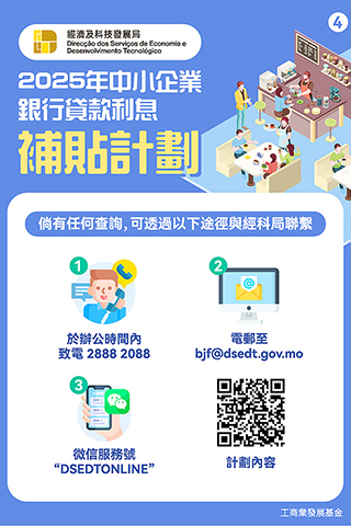 「2025利息補貼計劃」詳情可瀏覽經科局網頁(https://www.dsedt.gov.mo/zh_MO/web/public/pg_sme_bjcf)。如有任何查詢,可電郵至bjf@dsedt.gov.mo,亦可於辦公時間致電28882088或透過微信服務號「DSEDTONLINE」與經科局聯繫。◇